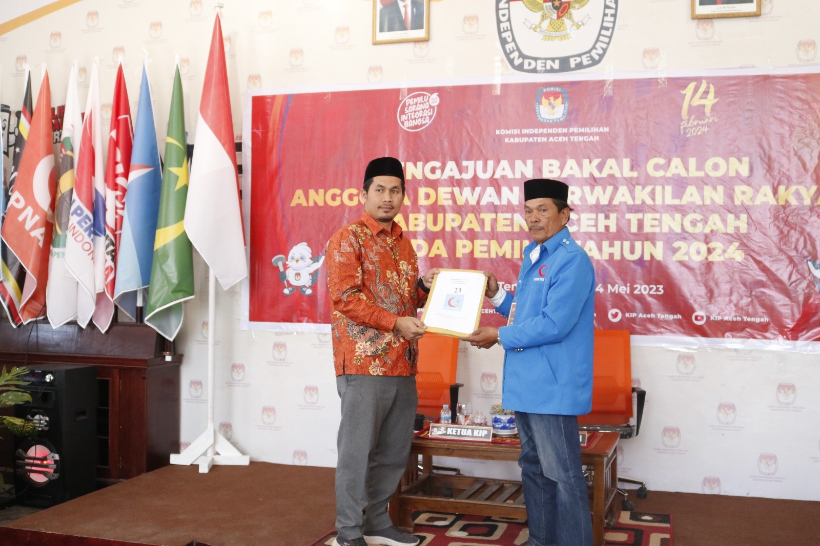 Delegasi partai diterima oleh Ketua KIP Aceh Tengah Sertalia, Anggota KIP Aceh Tengah Mukhlis, Marwansyah, Sunardi, dan Iwan Bahagia SP, serta Sekretaris KIP Aceh Tengah M. Sofyan di Aula Kantor KIP Aceh Tengah.