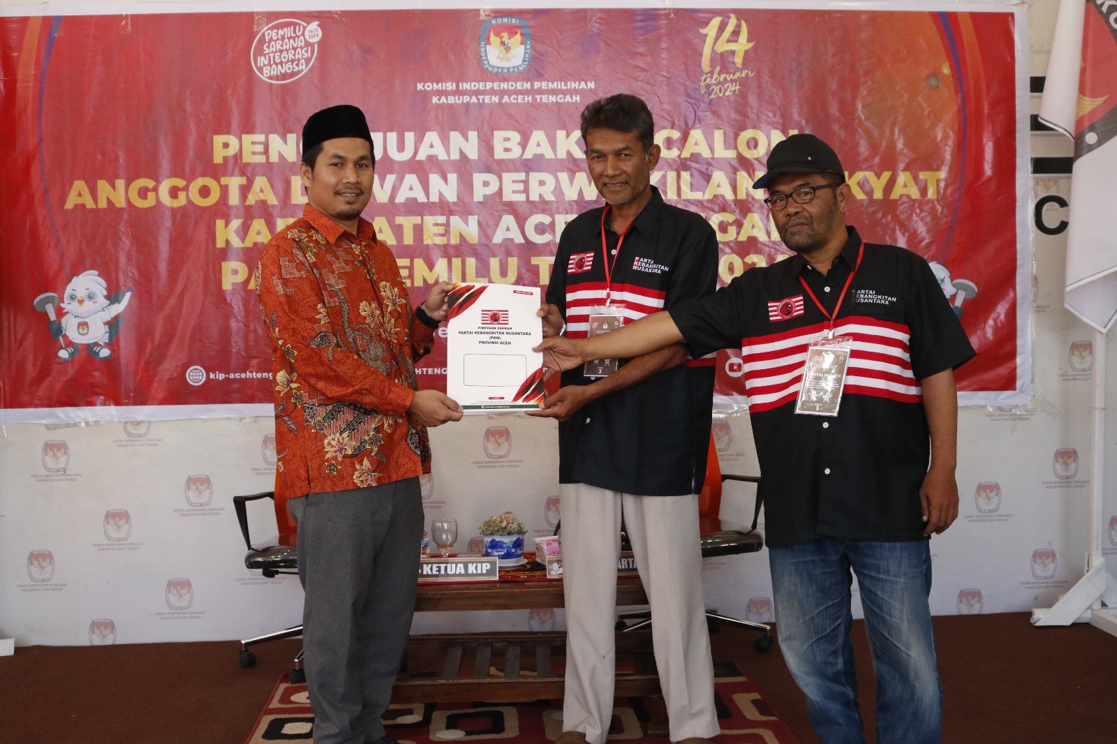 Delegasi partai diterima oleh Ketua KIP Aceh Tengah Sertalia, Anggota KIP Aceh Tengah Mukhlis, Marwansyah, Sunardi, dan Iwan Bahagia SP, serta Sekretaris KIP Aceh Tengah M. Sofyan di Aula Kantor KIP Aceh Tengah.