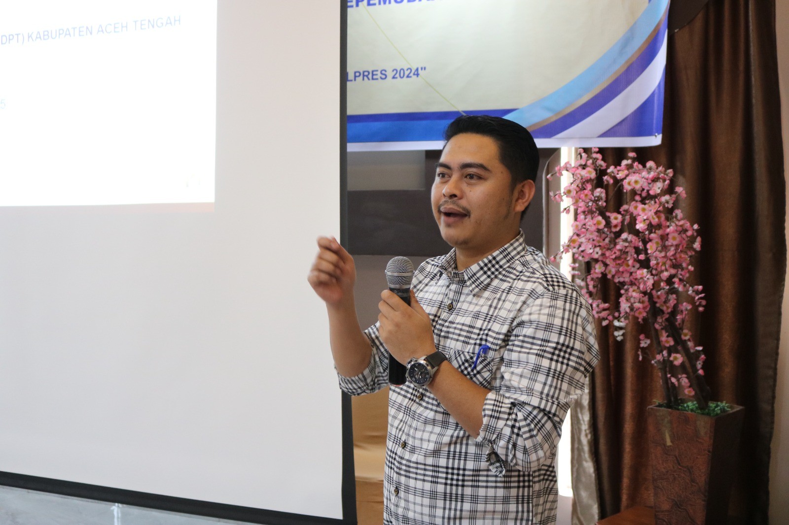 KIP ACEH TENGAH - Mukhlis, Komisioner Divisi Teknis Penyelenggaraan Pemilu KIP Aceh Tengah menjadi narasumber dalam Kegiatan Pelatihan Peningkatan Kapasitas SDM dalam Sektor Kepemudaan di Aceh Tengah Tahun 2023 yang diselenggarakan oleh Dinas Pemuda dan Olahraga setempat di Hotel Linge Land, Takengon, Kamis, 23 November 2023.
