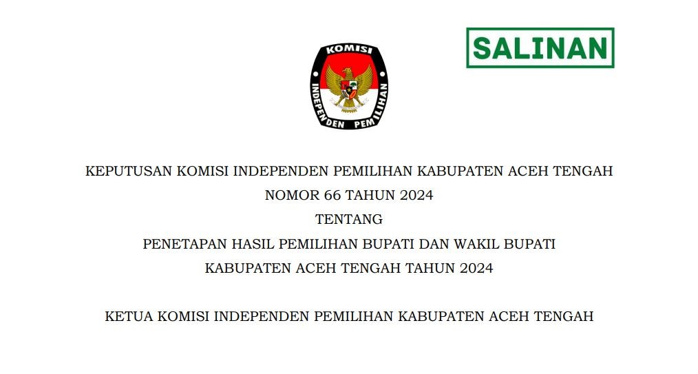Berikut kami sampaikan Keputusan Komisi Independen Pemilhan Kabupaten Aceh Tengah Nomor 66 Tahun 2024 Download