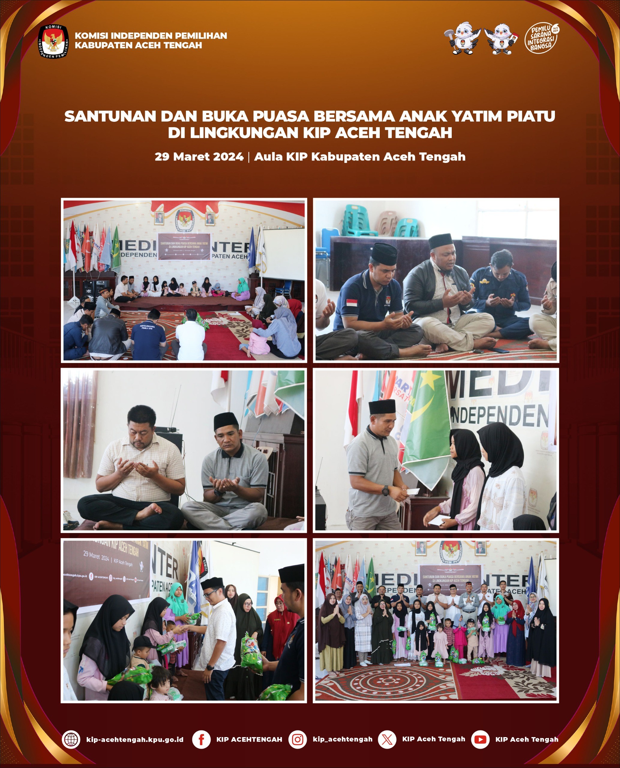 KIP ACEH TENGAH - Komisi Independen Pemilihan (KIP) Kabupaten Aceh Tengah melaksanakan santunan kepada anak yatim di lingkungan KIP Kabupaten Aceh Tengah, Jumat, 29 Maret 2024 di Kantor KIP setempat.