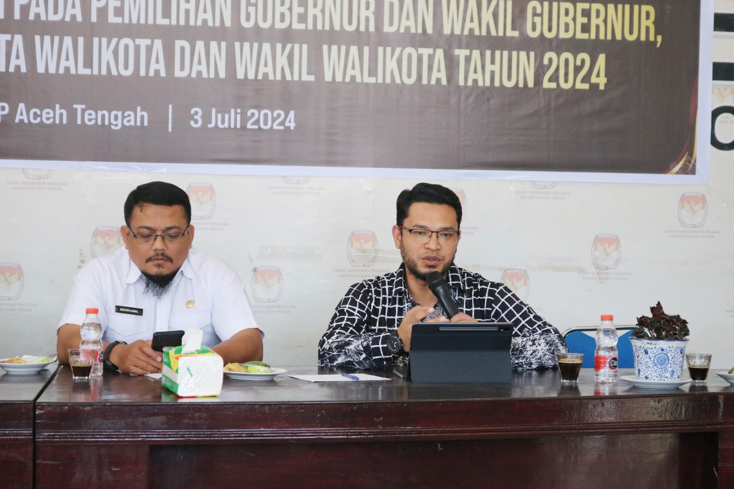 KIP ACEH TENGAH - Komisi Independen Pemilihan (KIP) Aceh Tengah melaksanakan Sosialisasi Pendaftaran Pemilih pada Pemilihan Gubernur dan Wakil Gubernur, Bupati dan Wakil Bupati serta Walikota dan Wakil Walikota Tahun 2024 di Aula Kantor Setempat, Rabu, 03 Juli 2024.