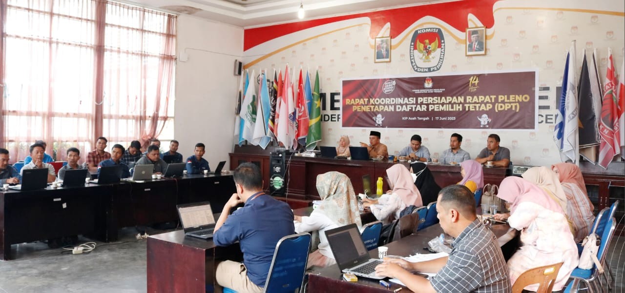 KIP ACEH TENGAH - Komisi Independen Pemilihan (KIP) Aceh Tengah melakukan Rapat Koordinasi Persiapan Rapat Pleno Penetepan Daftar Pemilih Tetap (DPT) di daerah tersebut, Sabtu, 17 Juni 2023. Rapat Pleno DPT rencana digelar pada 20 Juni 2023.