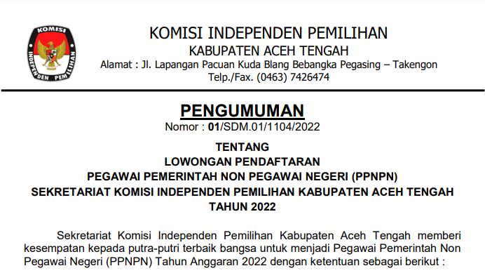 LOWONGAN PENDAFTARAN PEGAWAI PEMERINTAH NON PEGAWAI NEGERI (PPNPN) SEKRETARIAT KOMISI INDEPENDEN PEMILIHAN (KIP) KABUPATEN ACEH TENGAH TAHUN 2022 Minggu, 02 Januari 2022 00:00 1401 File Selengkapnya : Download Bagikan: Dilihat 1,401 Kali.
