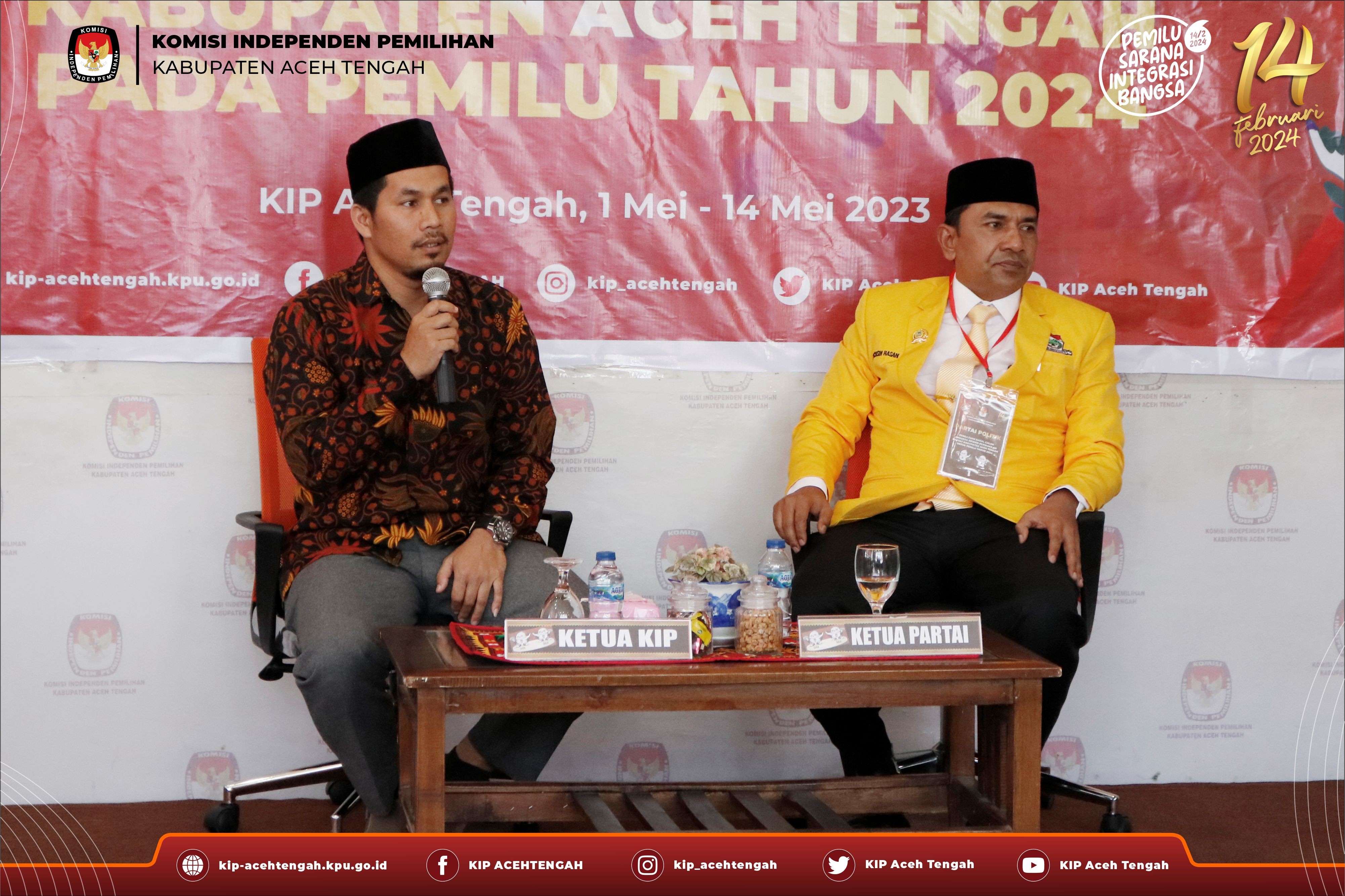 Perwakilan partai disambut oleh Sekretaris KIP Aceh Tengah, Muhammad Sofyan. Pengajuan bakal calon Anggota Dewan Perwakilan Rakyat Kabupaten (DPRK) berlangsung dari 1-14 Mei 2023.