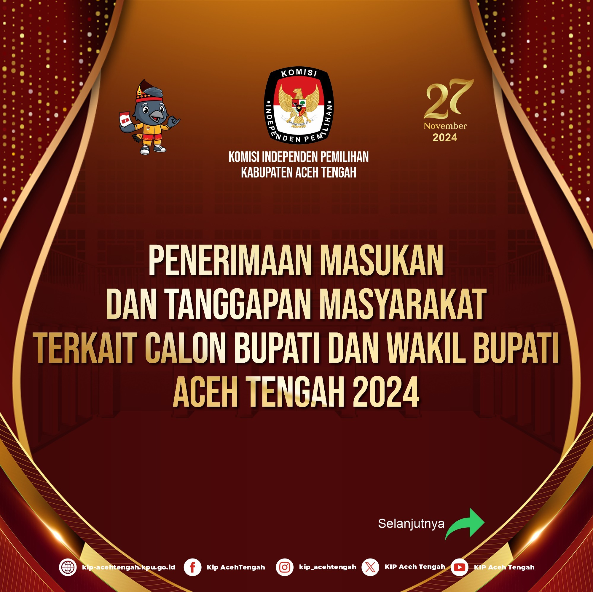 Berikut kami sampaikan Penerimaan Masukan dan Tanggapan Masyarakat Pasangan Calon Bupati dan Wakil Bupati Aceh Tengah pada Pemilihan Tahun 2024