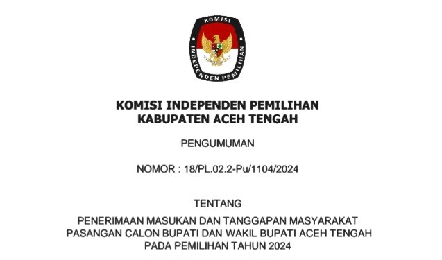Pengumuman Hasil Verifikasi Administrasi serta Penerimaan Masukan dan Tanggapan Masyarakat Pasangan Calon Bupati dan Wakil Bupati Aceh Tengah Tahun 2024