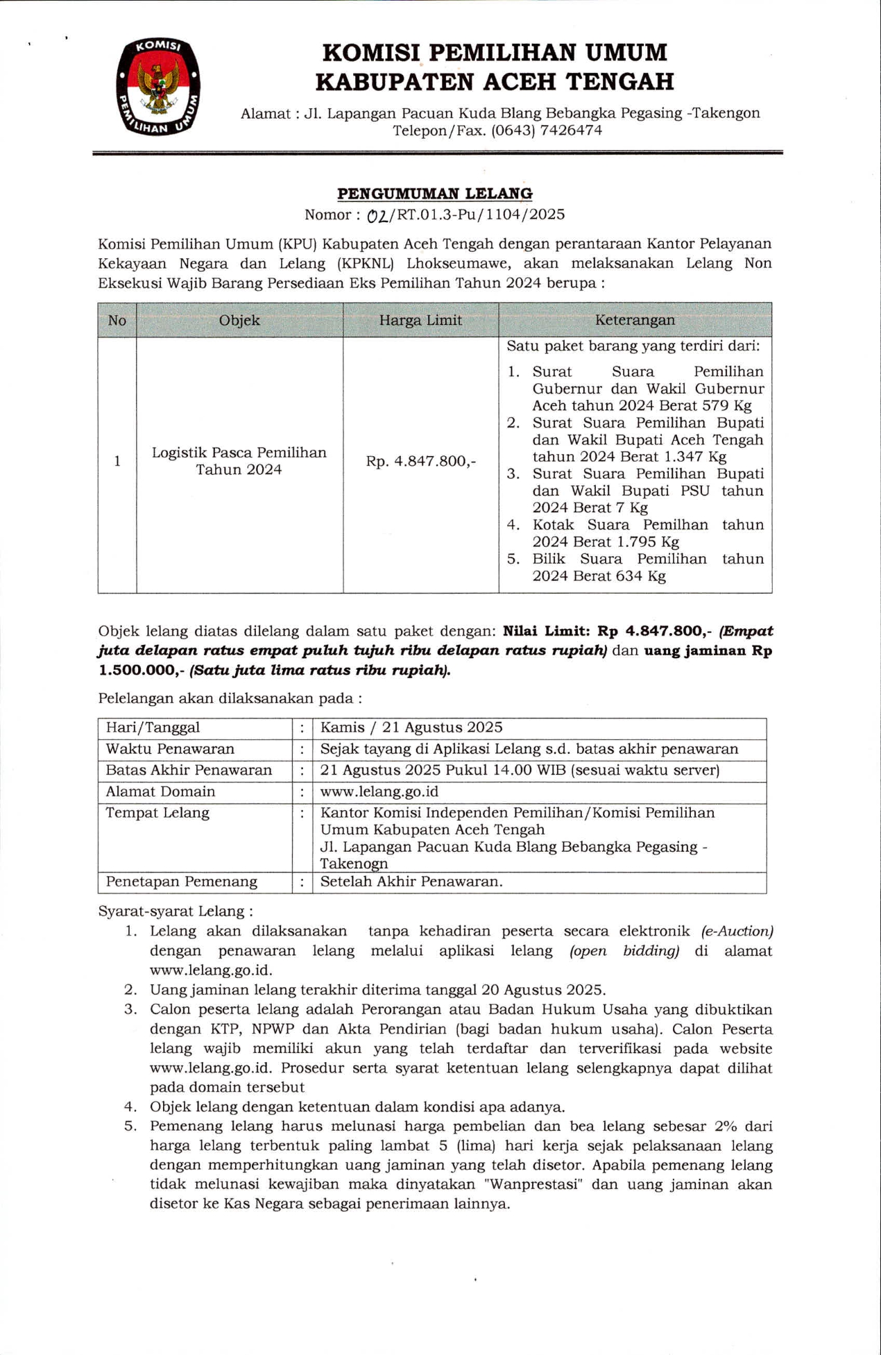 Pengumuman Lelang 2025 Tahap II Selasa, 12 Agustus 2025 11:37 89 Lelang PDF Download Bagikan: Dilihat 89 Kali.