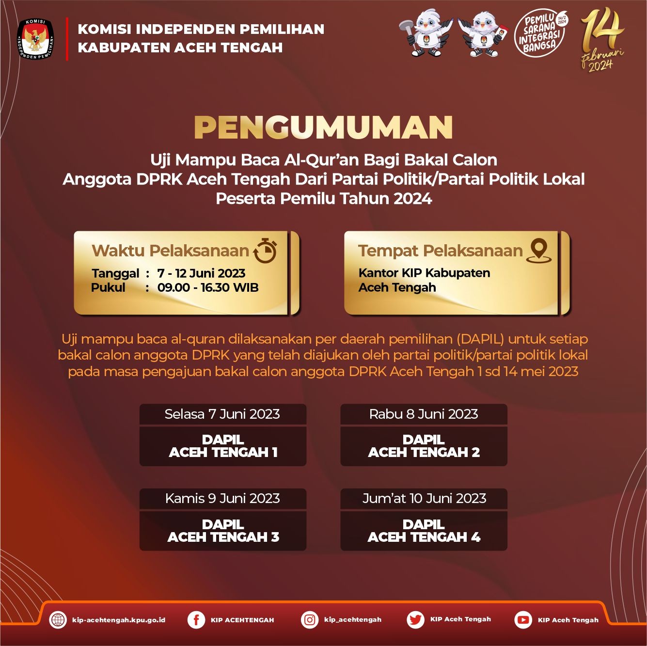 Pengumuman Pelaksanaan Uji Mampu Baca Al-Quran Bakal Calon Anggota DPRK Aceh Tengah Pemilu Tahun 2024