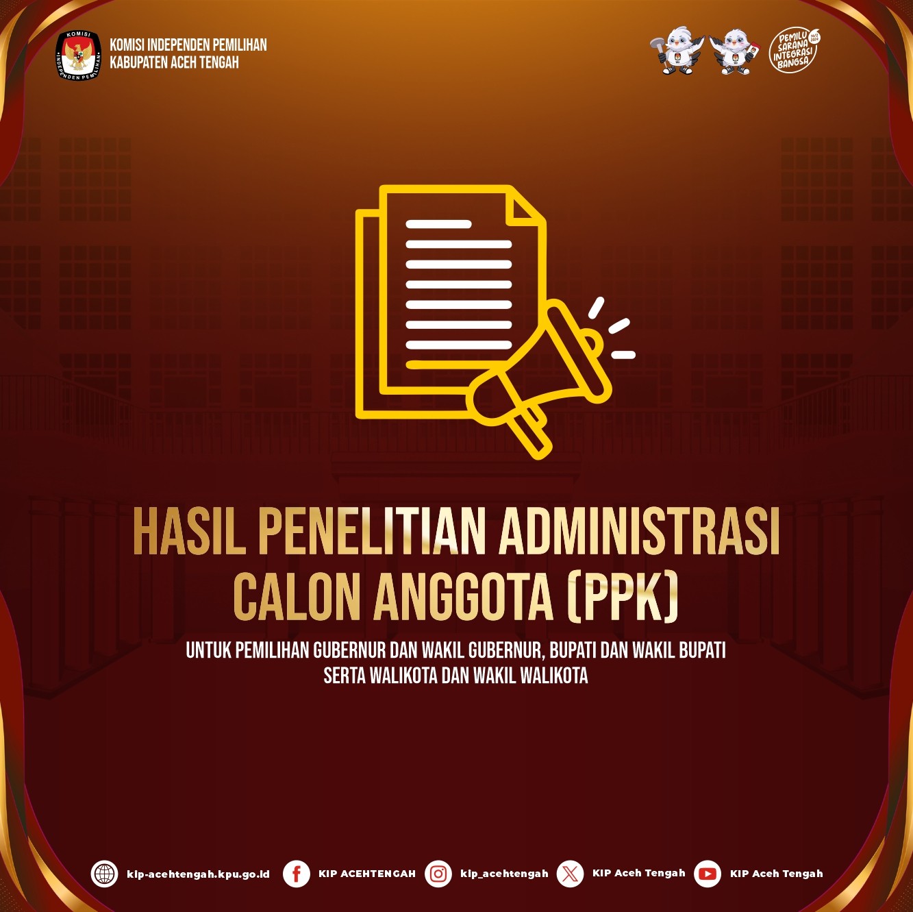 PENGUMUMAN SELEKSI ADMINISTRASI PPK PILKADA 2024 Minggu, 05 Mei 2024 07:00 432 PENGUMUMAN ADM PPK PILKADA 2024 Bagikan: Dilihat 432 Kali.