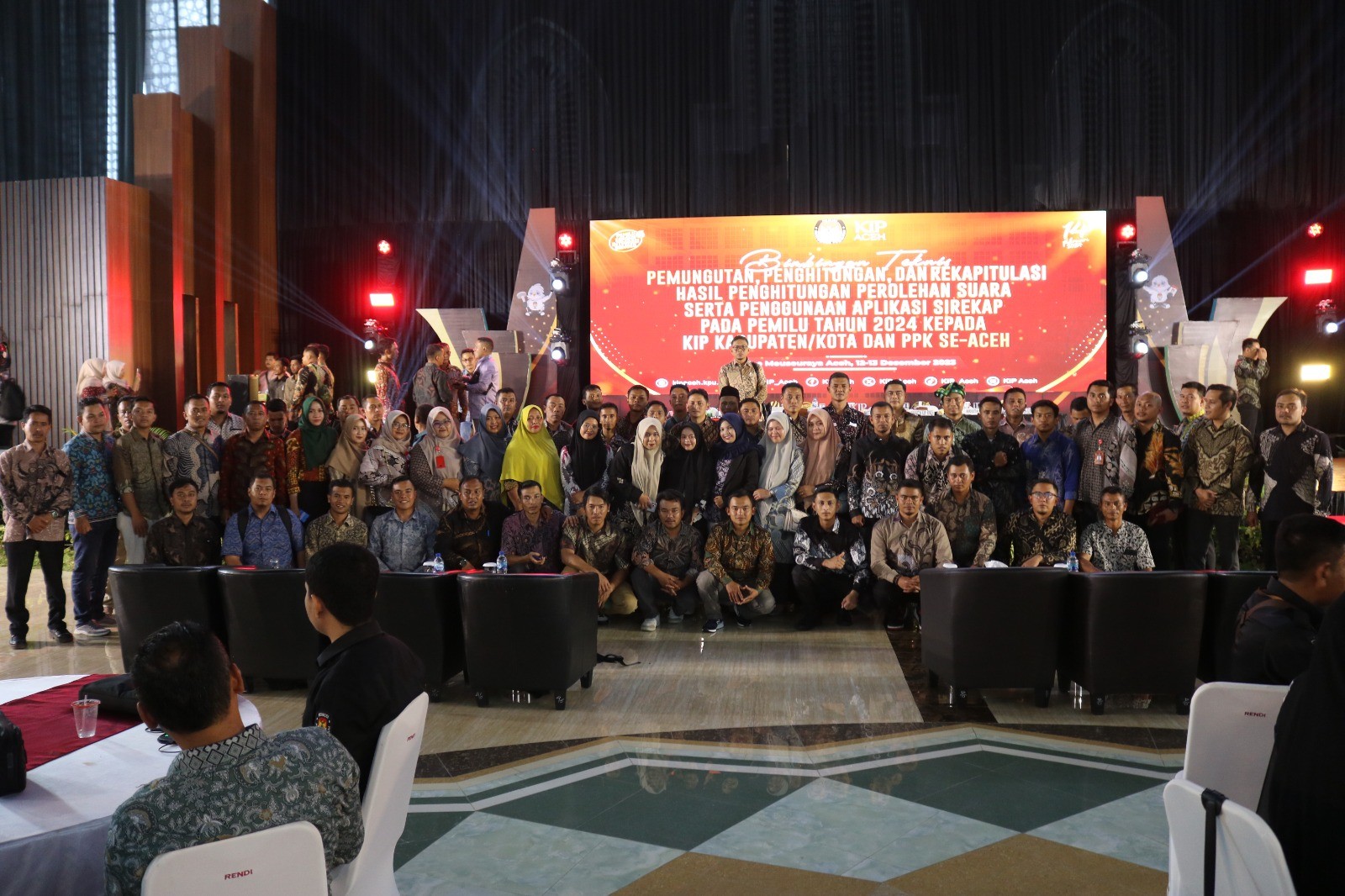 KIP ACEH TENGAH - Komisi Independen Pemilihan (KIP) Kabupaten Aceh Tengah bersama Panitia Pemilihan Kecamatan (PPK) se-Kabupaten Aceh Tengah mengikuti bimbingan teknis terkait pemungutan, penghitungan, dan rekapitulasi hasil penghitungan perolehan suara serta penggunaan aplikasi Sirekap pada Pemilu Tahun 2024 yang diselenggarakan oleh KIP Aceh di Bale Meusara Aceh, Banda Aceh, Rabu, 13 Desember 2023.