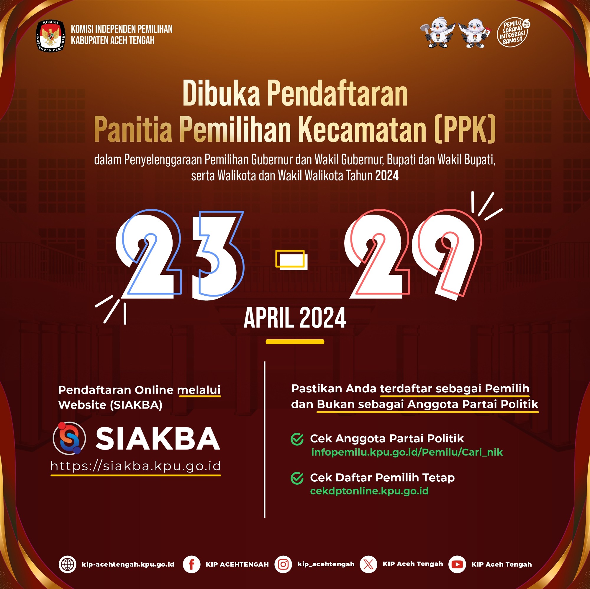 Seleksi Calon Anggota Panitia Pemilihan Kecamatan untuk Pemilihan Gubernur dan Wakil Gubernur, Bupati dan Wakil Bupati Tahun 2024 Selasa, 23 April 2024 07:00 444 unduh file PDF Download Bagikan: Dilihat 444 Kali.