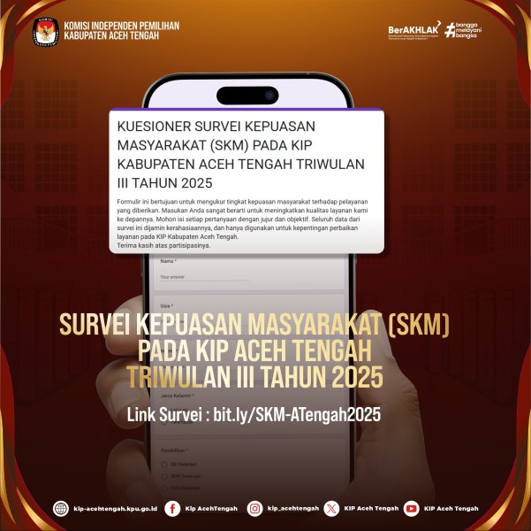 Survei Kepuasan Masyarakat (SKM) Triwulan III Tahun 2025 Rabu, 23 Juli 2025 11:40 180 Link Survei : Klik Bagikan: Dilihat 180 Kali.